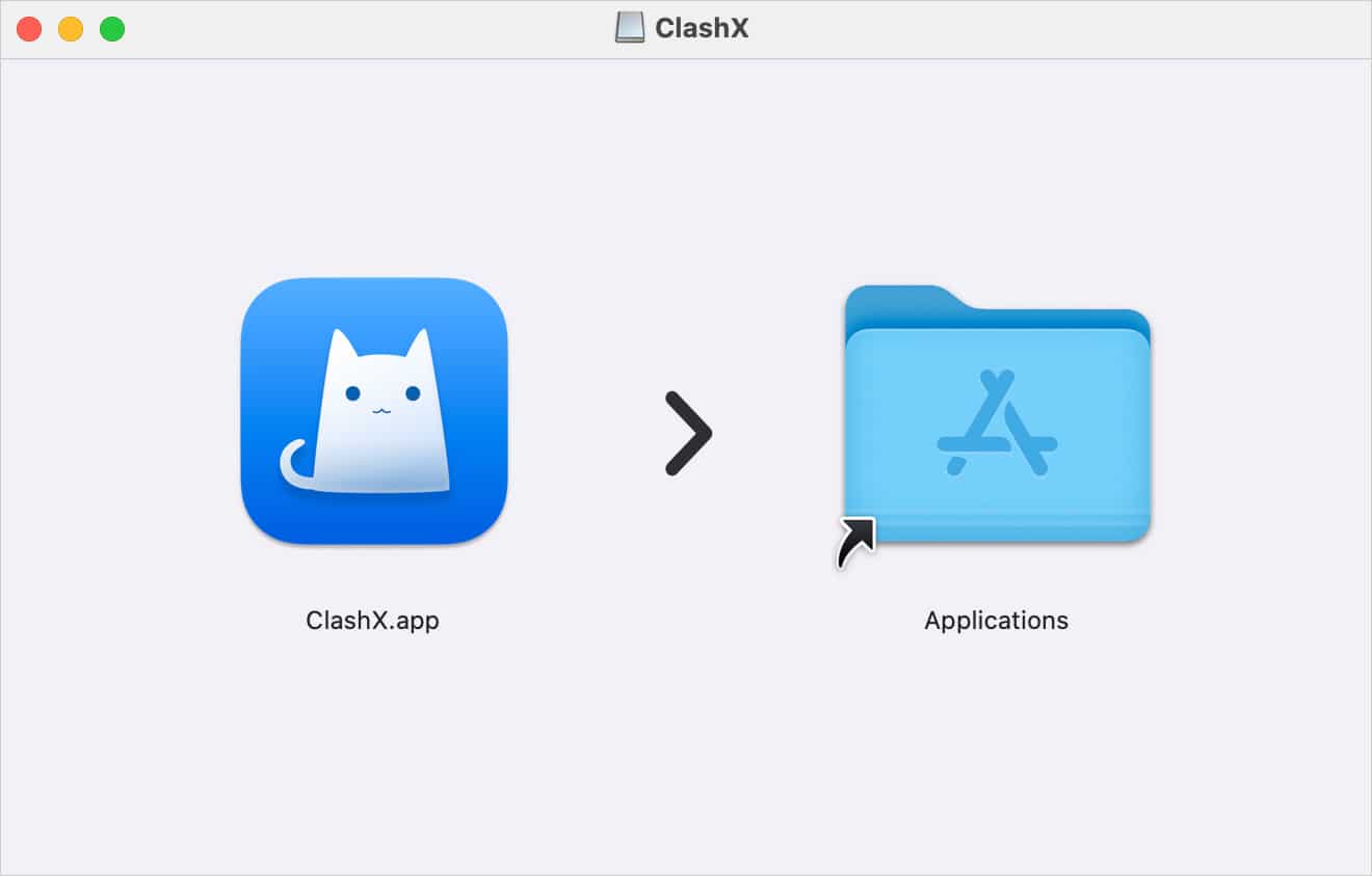 安装过程十分简单,和别的离线下载的软件一样,双击下载的 ClashX.dmg 文件,如何判断下载哪个版本,查看本站最新版下载页面当中的说明,然后根据提示将 ClashX.app 拖拽到 Applications 文件夹当中,就算完成了安装工作,如下图所示。